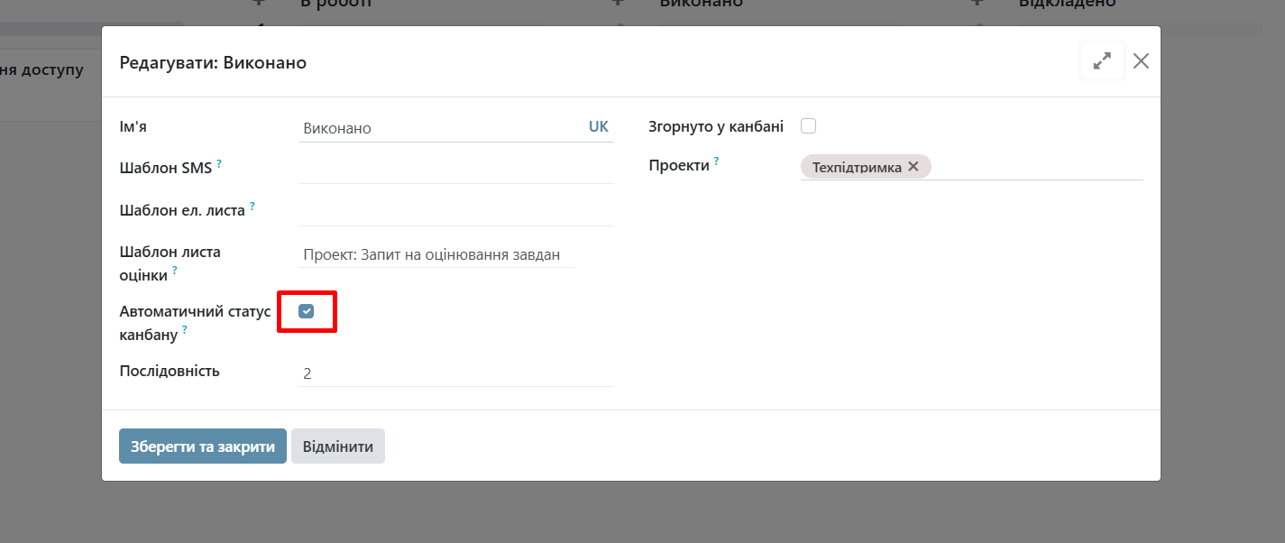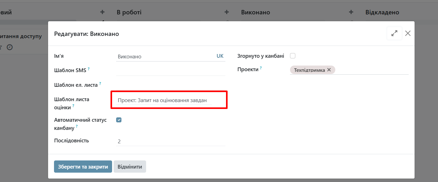 3. Опціонально: в налаштуваннях стадії можна включити «Автоматичний статус канбану» — тоді стан задачі буде змінюватися залежно від оцінки клієнта (наприклад «Схвалено» при хорошому відгуку, «Запит на зміни» при нейтральному чи негативному відгуку).