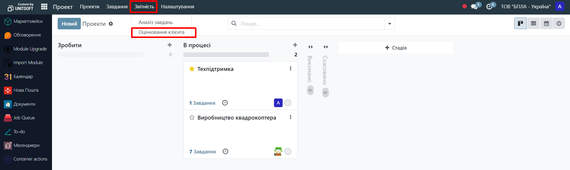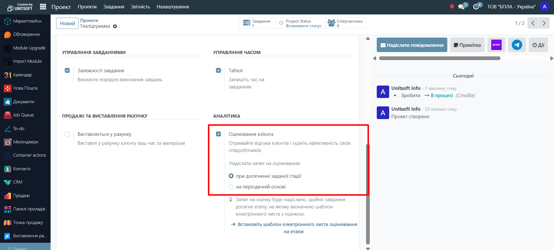 Функція «Оцінювання клієнта» в модулі «Проєкти» дозволяє автоматично просити клієнта оцінити виконану роботу (за завданням або проєктом) — при переході задачі в задану стадію або періодично. Лист із посиланням на форму оцінки надсилається автоматично за шаблоном, який ви вкажете.