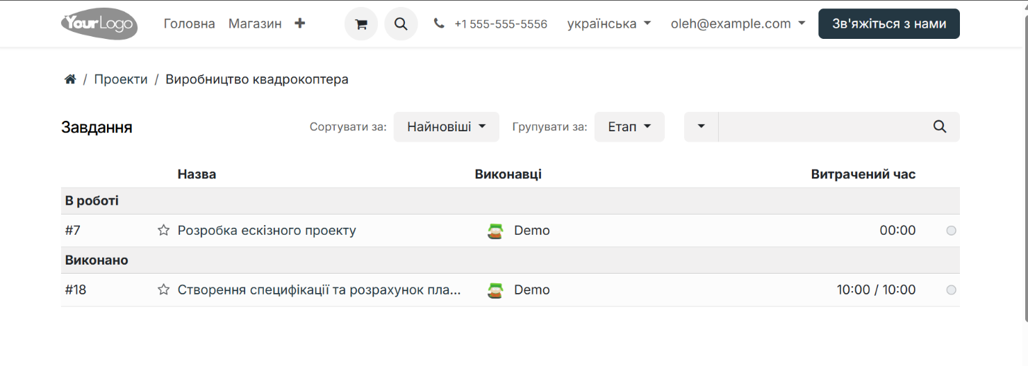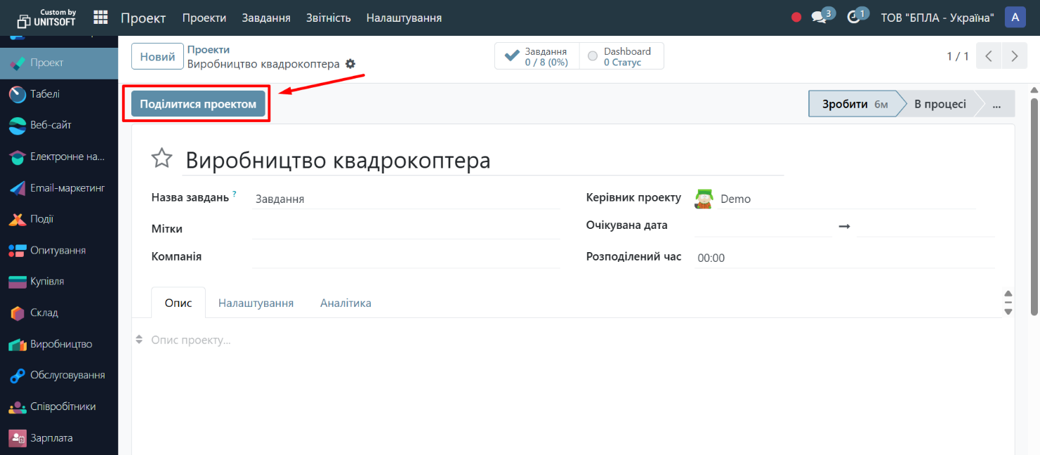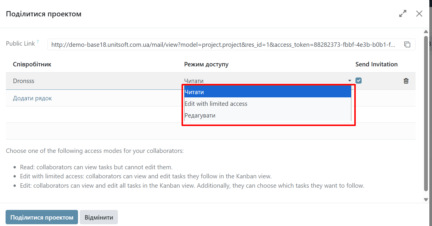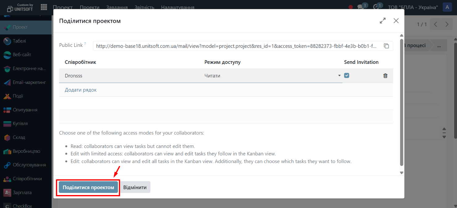 Функція «Поділитися проектом» дозволяє надати доступ до проекту Вашим клієнтам або колегам без необхідності відкривати для них усю систему Odoo.