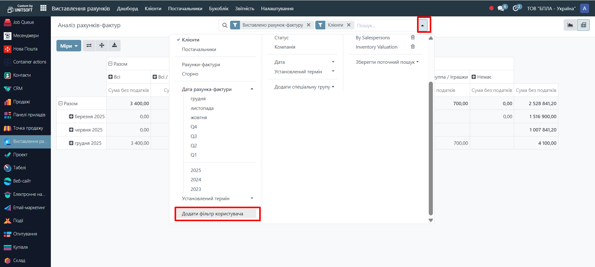 Найчастіше використовується фільтр за датою рахунку або датою документа.