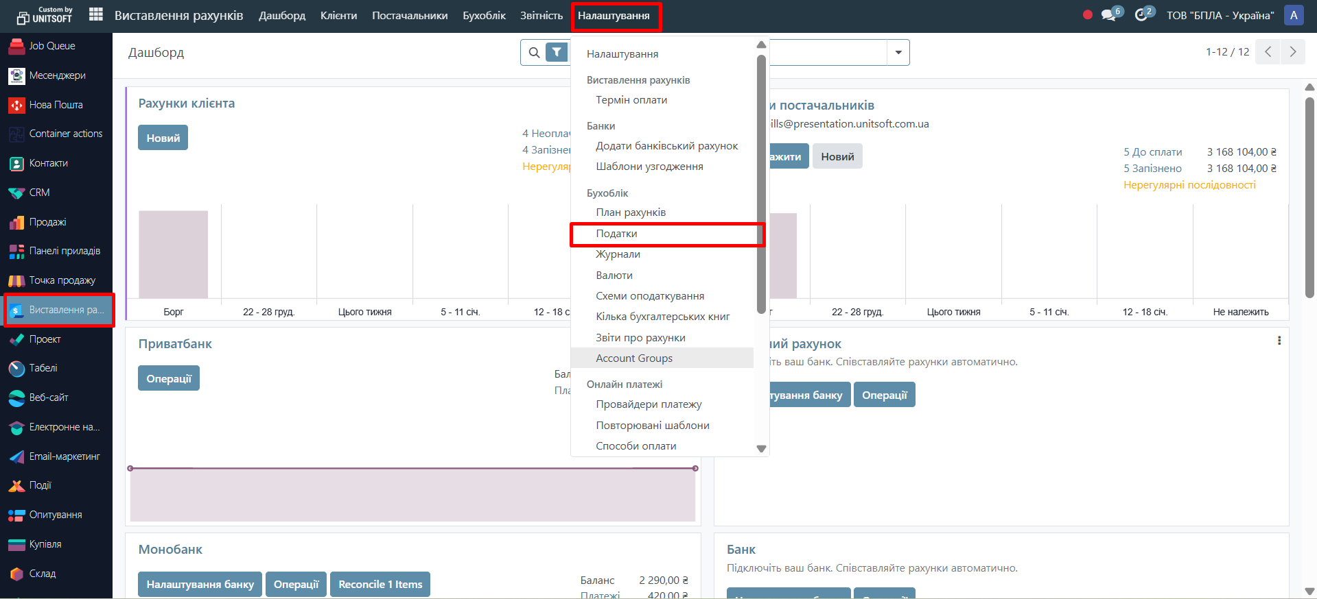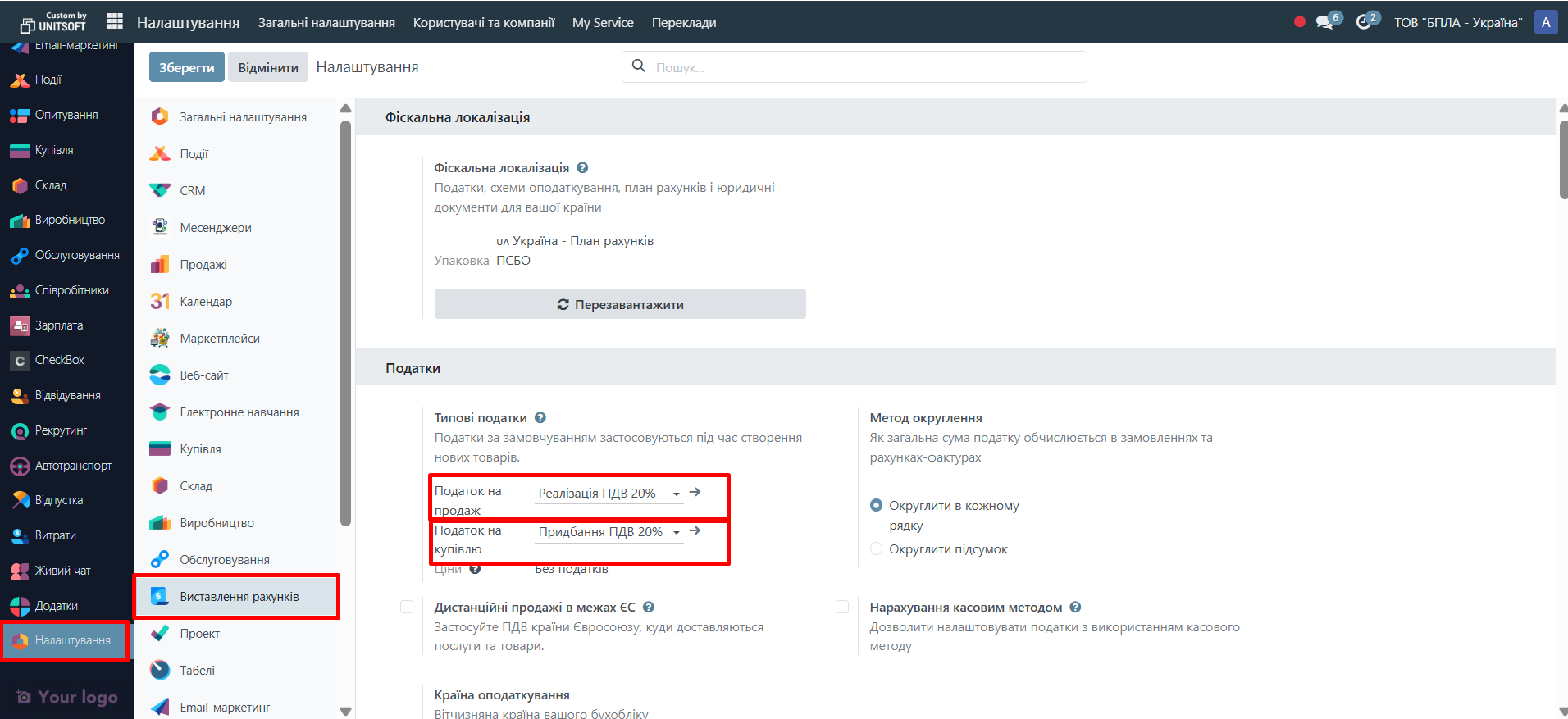 Щоб переглянути або змінити податки, перейдіть в модуль «Виставлення рахунків» - «Налаштування» - «Податки»: