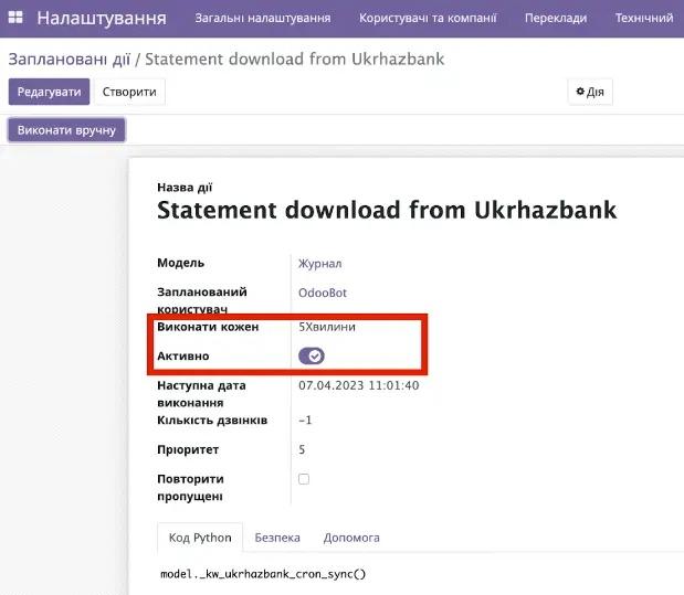Для налаштувань автоматичного завантаження виписки потрібно налаштувати “заплановану дію”. Для цього перейдіть в режимі розробника в розділ Технічний / Заплановані дії. Відкрийте “Statement download from Ukrhazbank”. Встановіть необхідну частоту завантаження виписки та активуйте. Саме по цій частоті і буде автоматично завантажуватись ваша виписка.